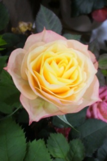 淡いピンクから白のグラデーションのまんまるいバラです。